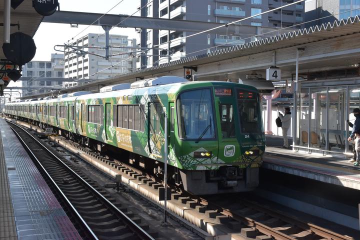 Keihan car 608 near Keihan-otsukyo station, carrying full advertising for Wuthering Waves. This station is in walking distance of JR’s Otsukyo station.