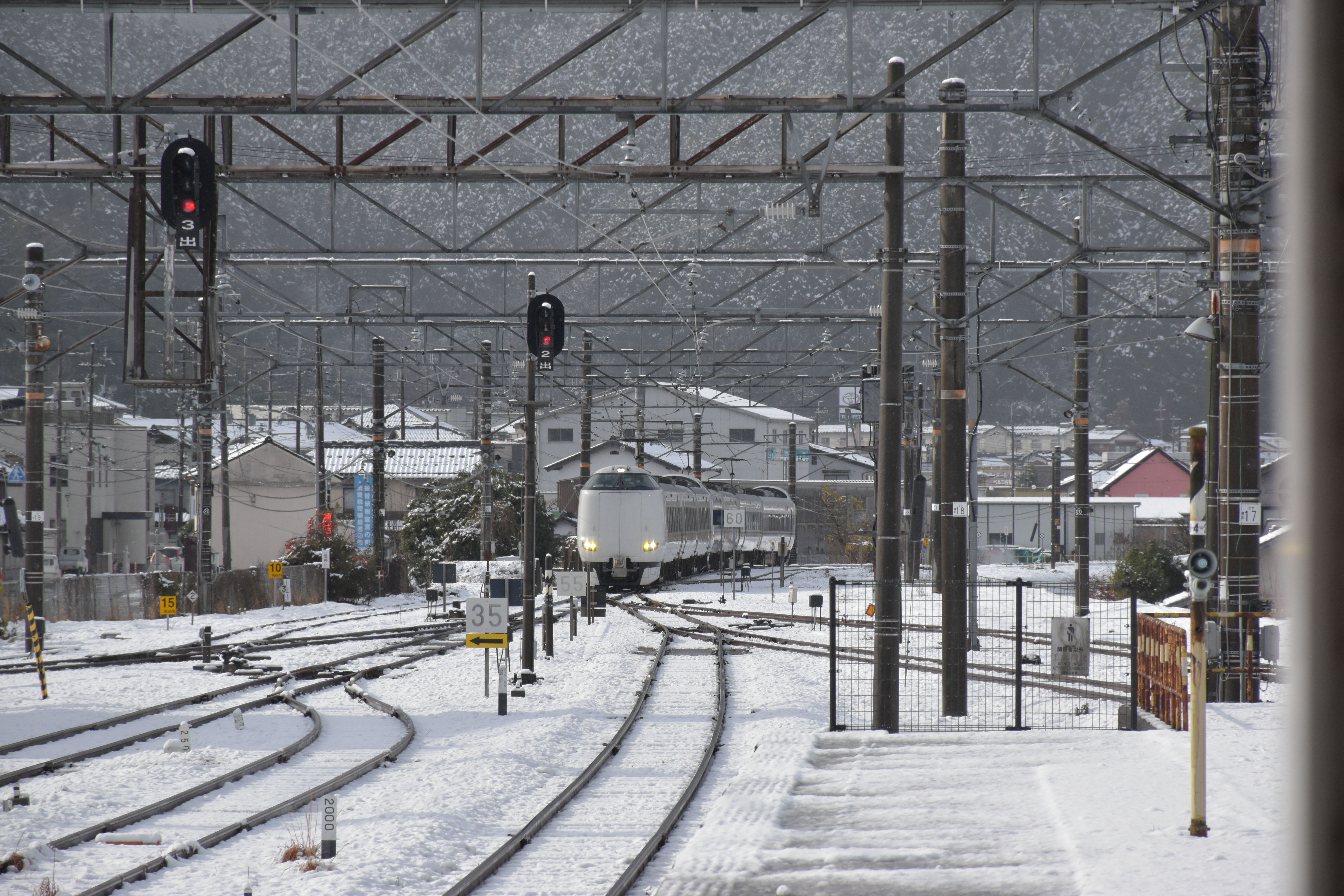 I continued to Teramae with the next train. Teramae is where the electrified section of the Bantan Line ends, and the Teramae - Wadayama section is operated by diesel railcars. Unfortunately, the connection between the two services is a bit shit, and the train to Wadayama left 35 minutes after the train from Himeji and Fukusaki had arrived. While waiting, sleet began to fall, which soon turned to thick snowflakes.