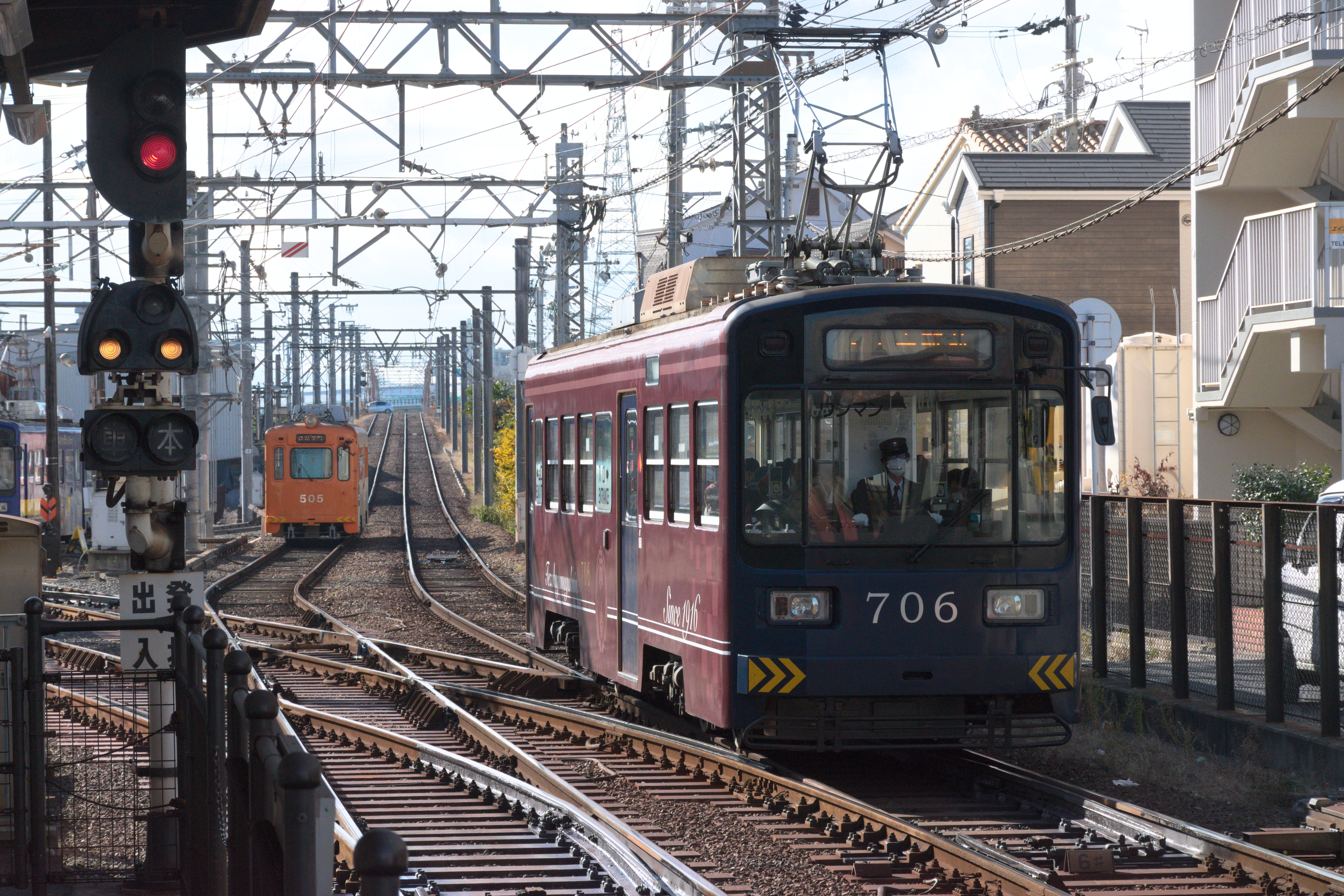 A 501 Series car approaching Ebisucho, the northern terminus of the Hankai Line.