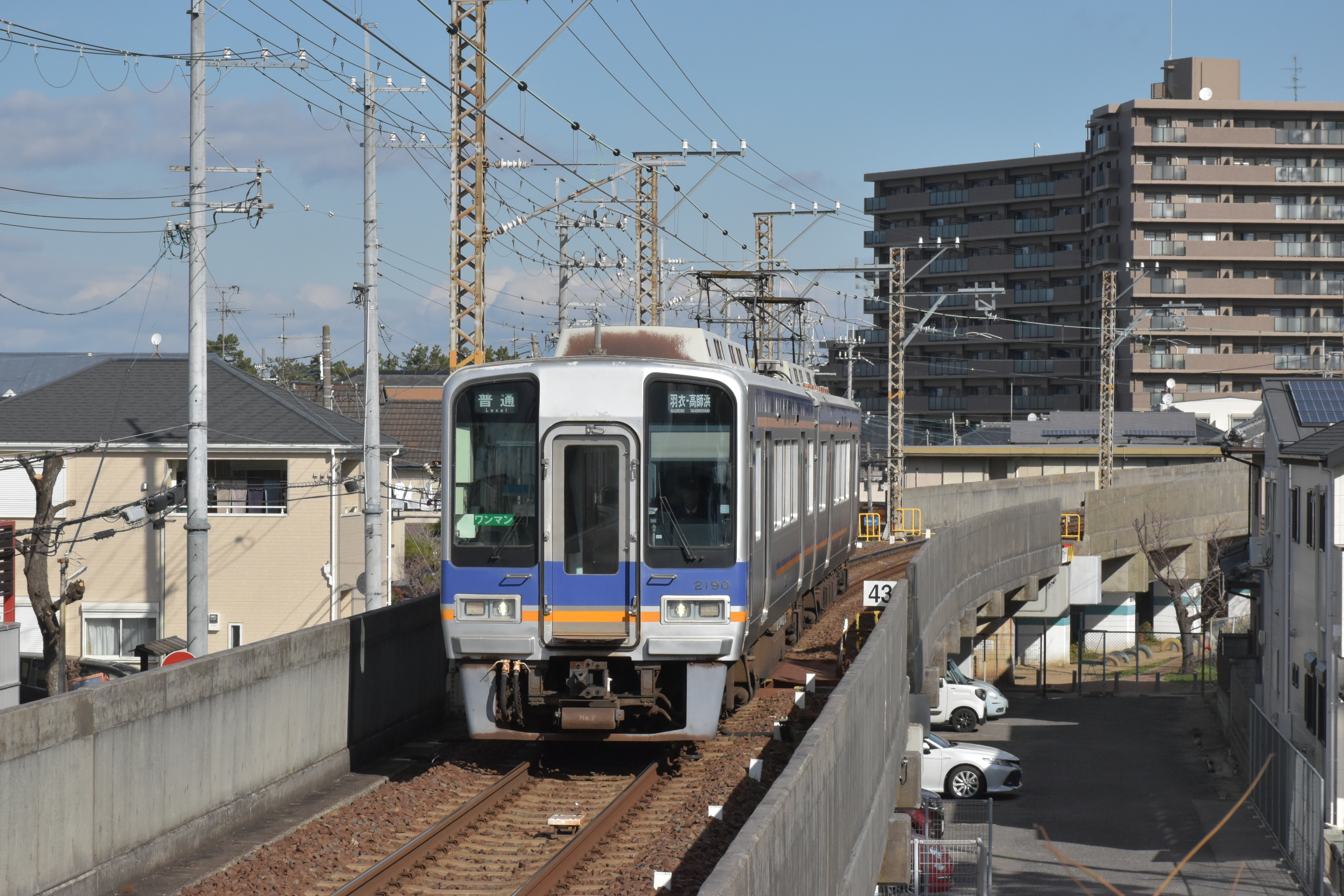A Nankai 2000 Series EMU approaching Takashinohama. This train only goes to nearby Hagoromo station, where I changed onto a Nankai Main Line train back to Osaka-Namba.