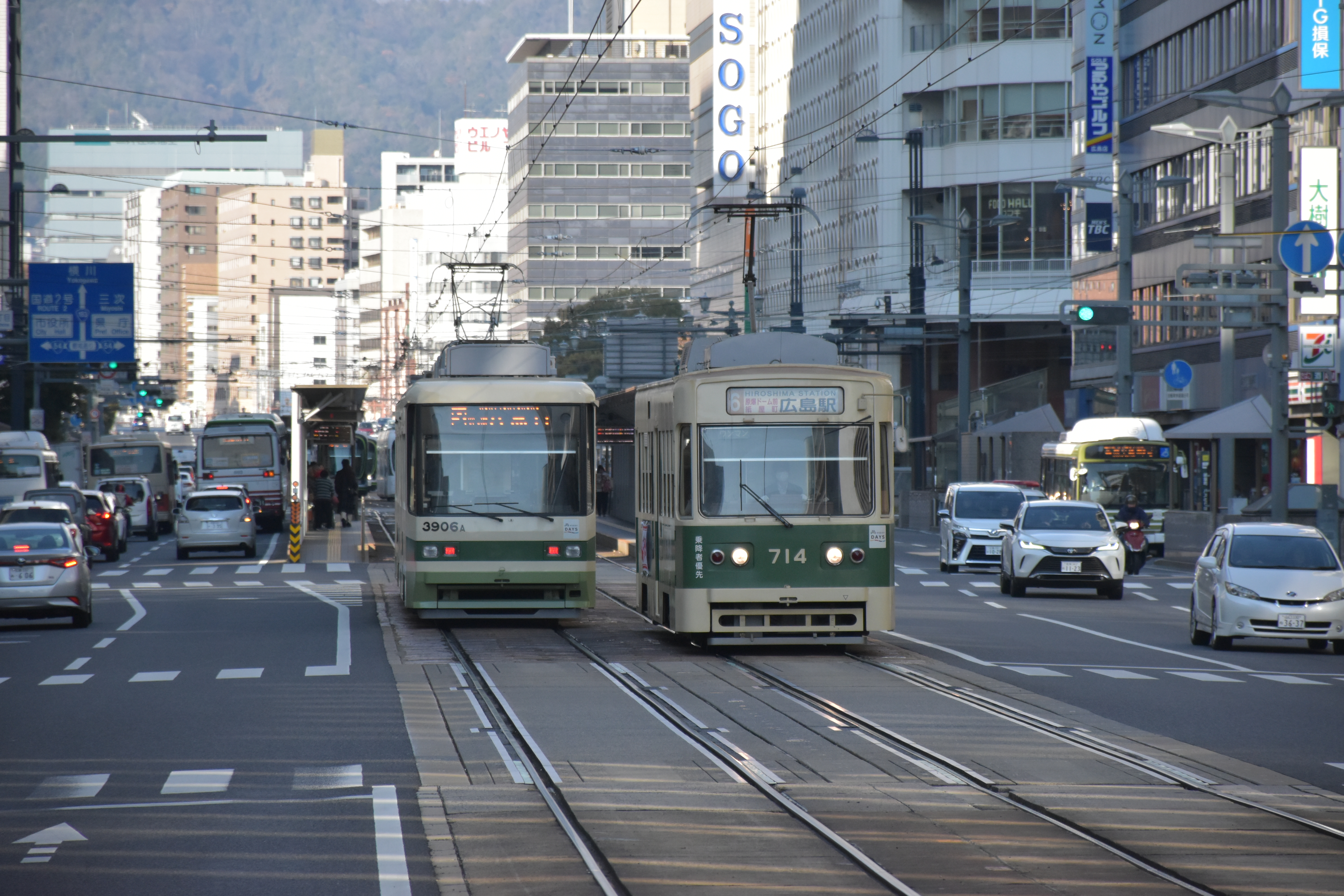 A 3900 Series “Green Liner” (66 seats) meets a 700 Series car (37 seats) near Tatemachi station