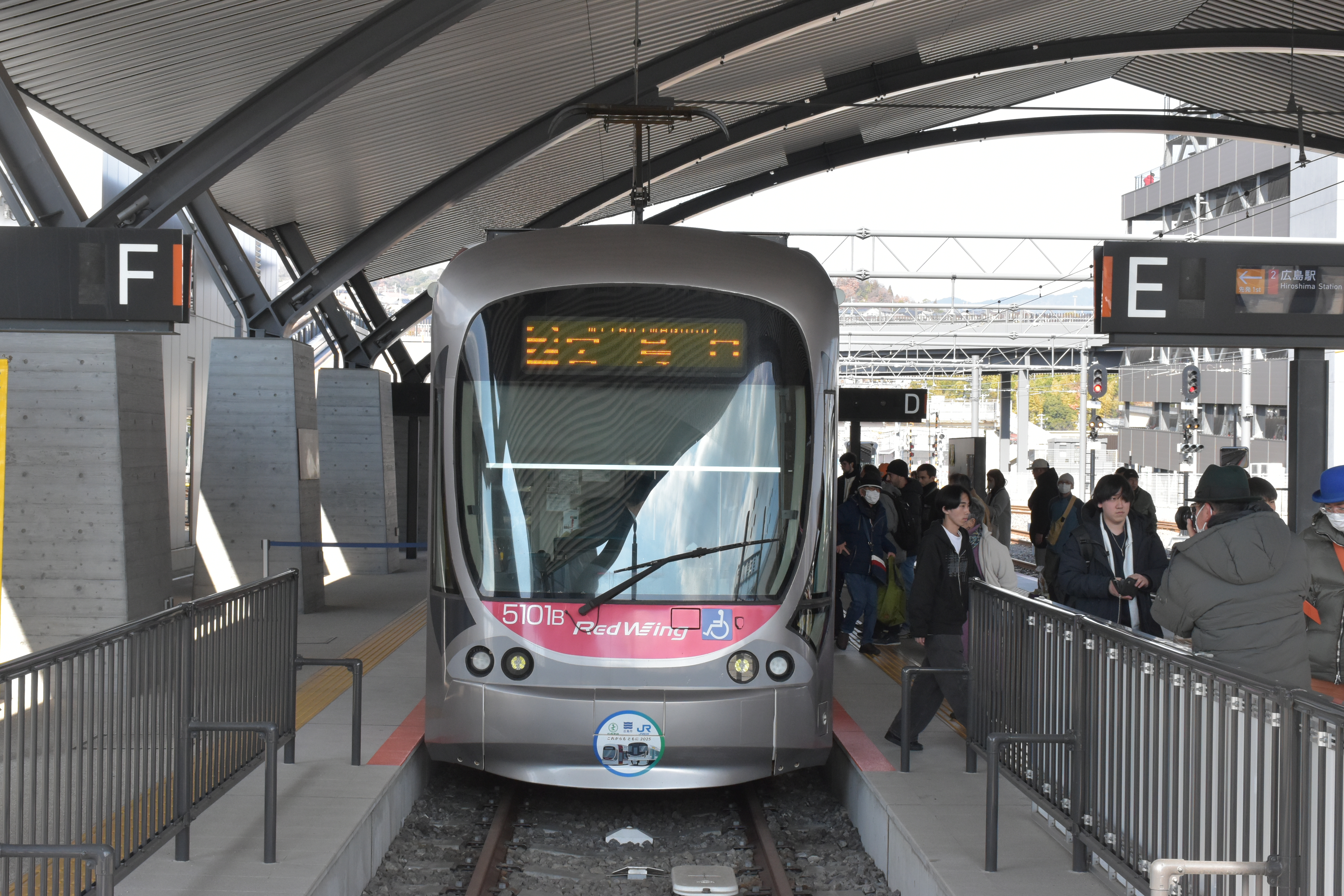 This photo was taken at Hiroden-miyajima-guchi, endpoint of the Hiroden Miyajima Line. This line is licensed and operated as a railway between Hiroden-nishi-hiroshima (in front of JR’s Nishi-Hiroshima station) and Hiroden-miyajima-guchi, but operated with regular streetcars which continue onto the streetcar network to reach Hiroshima station. This 5100 Series “Green Mover MAX” train is painted in JR West’s “Red Wing” color scheme used on local trains around Hiroshima as part of a cross-promotion.