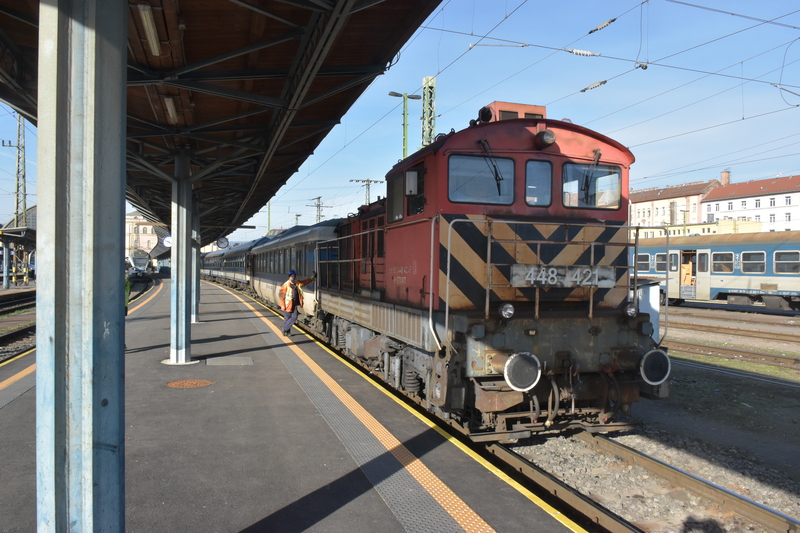 A 448 series shunter at Budapest-Keleti. The first car of the train appears to be an ex-ÖBB "Schlierenwagen".