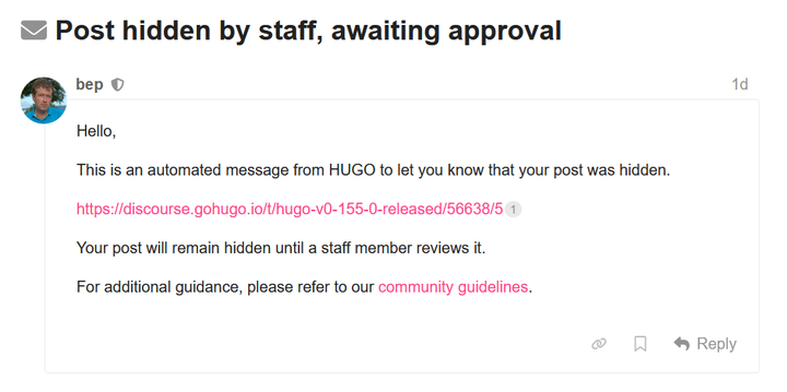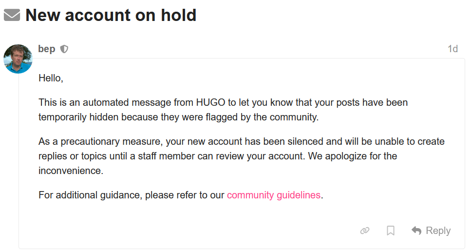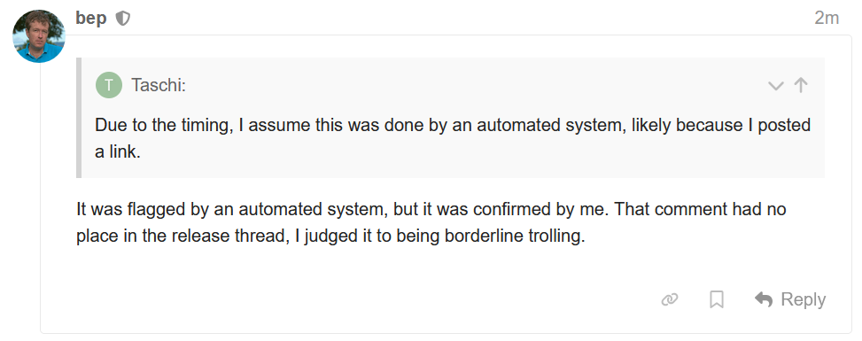 It didn’t - bep (moderator and lead dev) posted a couple of comments on the forum, including in the thread where I had originally posted, but seemingly never got around to looking at his mod queue. At this point, I still was willing to give him the benefit of the doubt and answered to one of his mod messages: