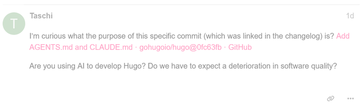 This immediately raises alarm bells for me. LLM-generated code is demonstrably low-quality and poorly maintainable, no matter how politely you ask the LLM to write good, maintainable code. As I rely on Hugo to maintain my website, I obviously do not want it to become unmaintainable slopware. But I did not just want to assume the worst - this might just have slipped in by accident, or as part of one dev playing around with the technology for a bit out of curiosity. So I asked a question: